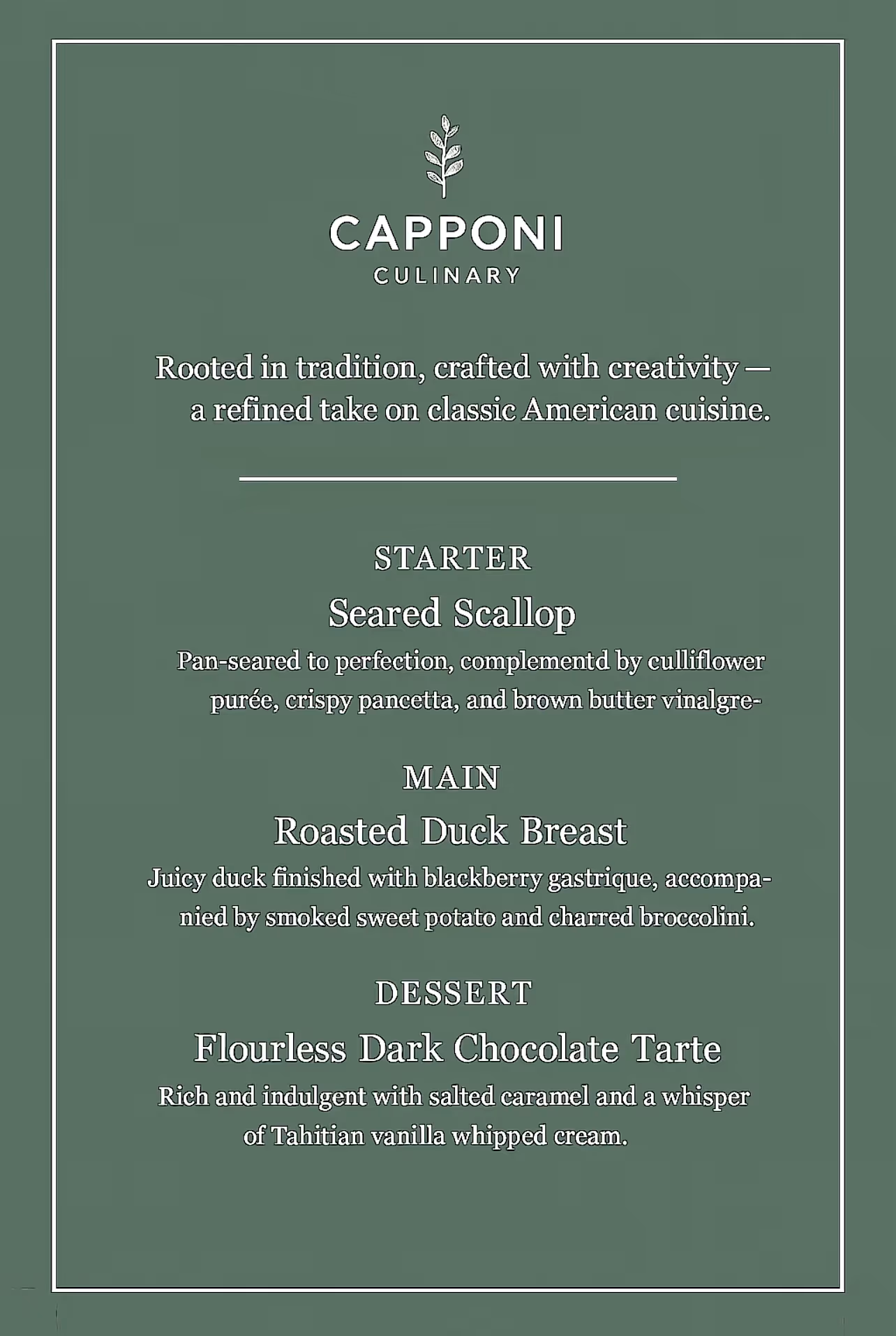 Imagine being able to say, “I have my own private chef.” With Capponi Culinary, that’s exactly what you get. I come directly to your home to cook fresh, chef-crafted meals tailored to your lifestyle and taste. Everything is prepared in your own kitchen, packaged for convenience, and stored with care. I handle the entire process — shopping, cooking, cleaning, and organizing — so you can enjoy restaurant-quality meals without the stress of cooking or the mess left behind. Whether you’re looking for healthy weekly options, family-friendly dinners, or meals designed around your dietary needs, my service is built around one thing: giving you more time to enjoy life while still eating beautifully.